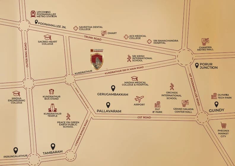 Casagrand Massimo is a massive Roman themed high-rise community spread across 7.9 acres with 853 apartments consisting of 2, 3 & 4 BHK spacious homes. It offers 70 world-class amenities and 24000 sqft. ultra-modern clubhouse with best indoor amenities. With 85% open spaces and premium specification, the units are planned to give an aesthetic appeal & better ventilation for a luxury and comfortable lifestyle.